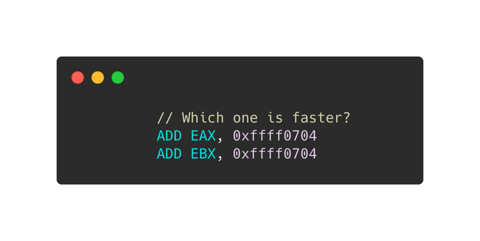 Instruction selection is a critical component of compilers, as different instructions can cause significant performance differences even when the semantics remain unchanged. Does register selection also affect performance (assuming the register selection does not lead to more or fewer register spills)? Honestly, I never intentionally thought about this question until I came across it on Zhihu (a Chinese Q&A website). But this is a really interesting topic that touches on many tricks of assembly programming and compiler code generation. So it deserves a blog post to refresh my memory and share my thoughts :)