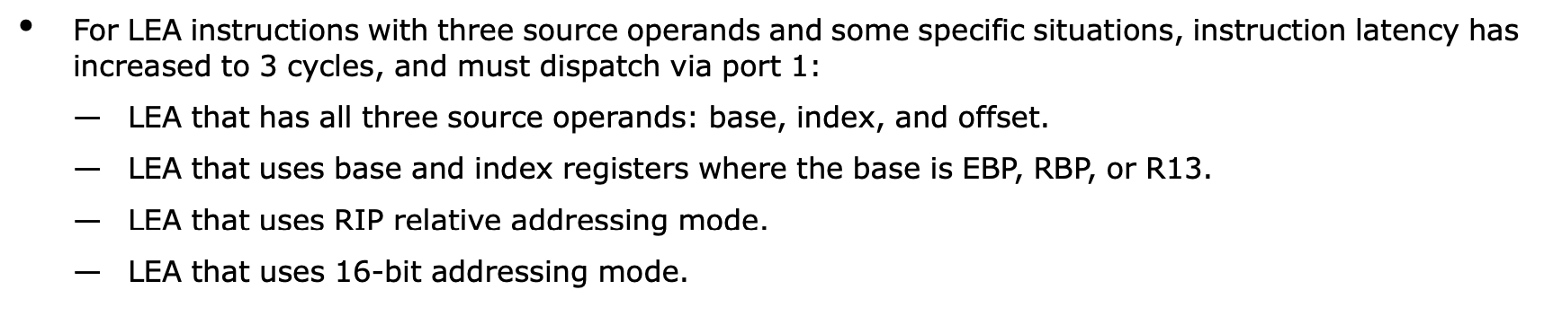 LEA was designed to leverage the complex and powerful x86 addressing mode for wider applications, such as arithmetic computations, which requires fewer registers for intermediate results than arithmetic instructions. However, certain forms of LEA can only be executed on port 1, and those LEA forms with lower ILP and higher latency are called slow LEA. According to the Intel optimization manual, using EBP, RBP, or R13 as the base address will make LEA slower.