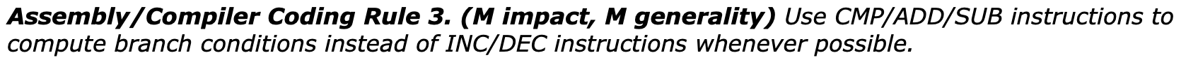 Consequently, on certain Intel architectures, compilers usually do not generate INC/DEC for loop counter updates (i.e., i++ in for (int i = N; i != 0; i--)) or reuse the FLAGS produced by INC/DEC for JCC. On the other hand, this increases code size and can cause I-cache issues. Fortunately, Intel has fixed the partial register stall on FLAGS since SandyBridge